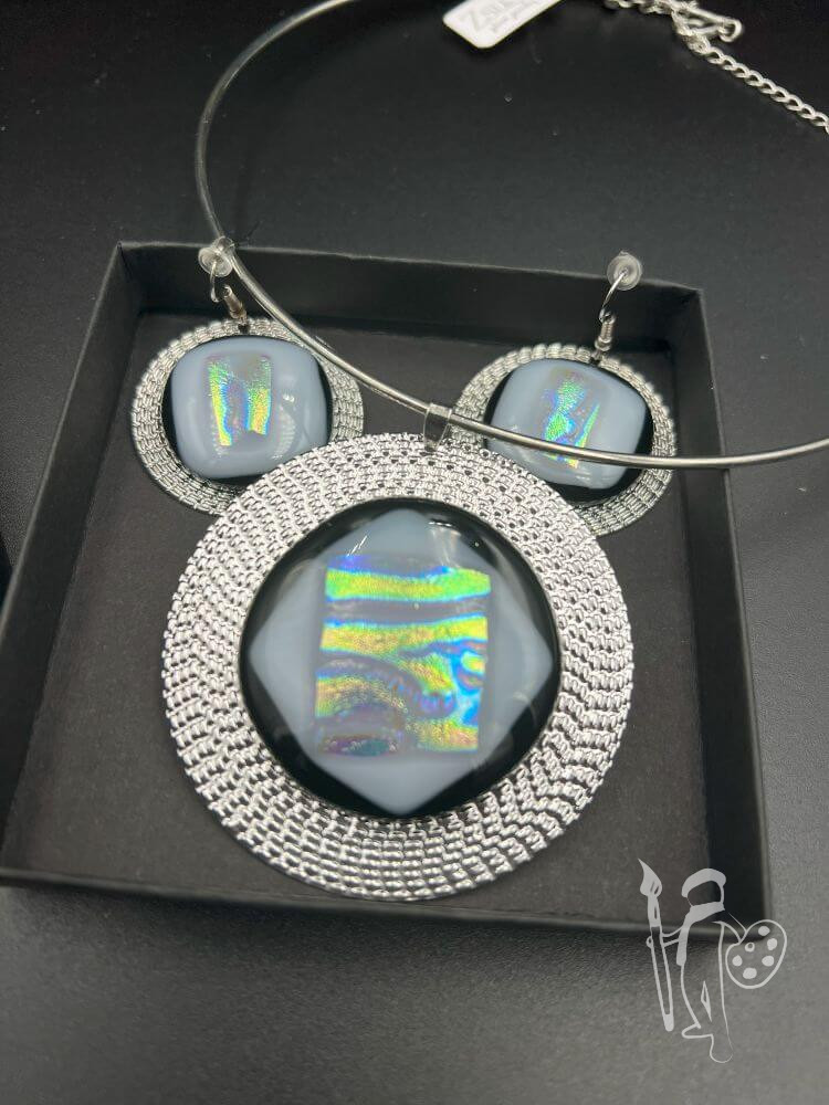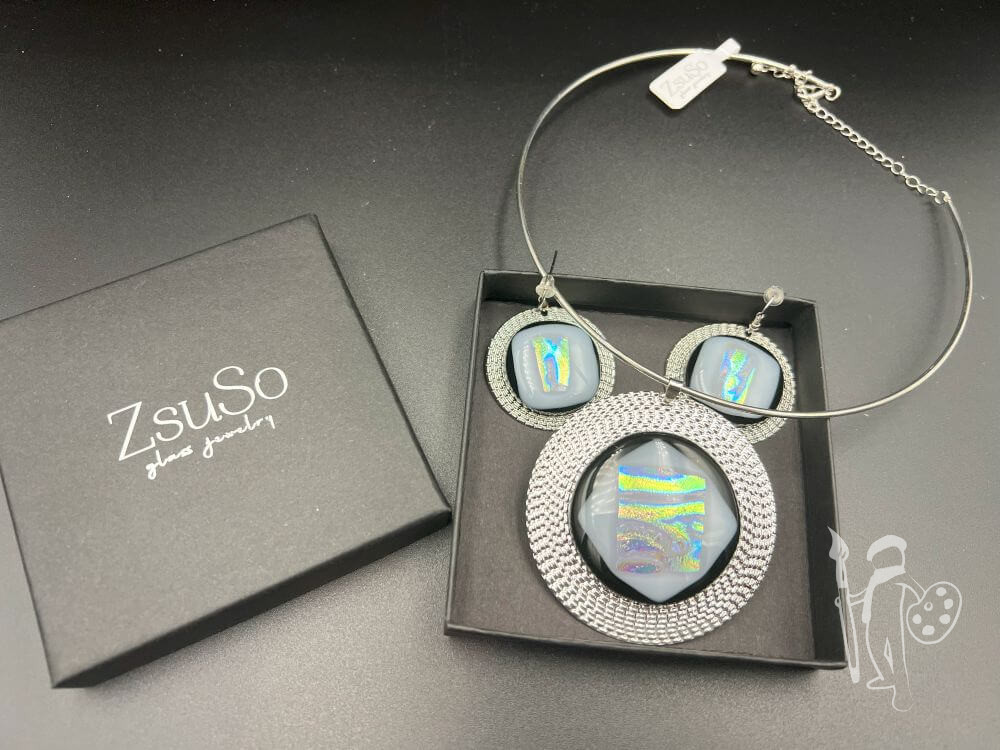 860 fokon olvasztott Dichroic és Bullseye üvegekből egyedileg készítettek a díszek.
