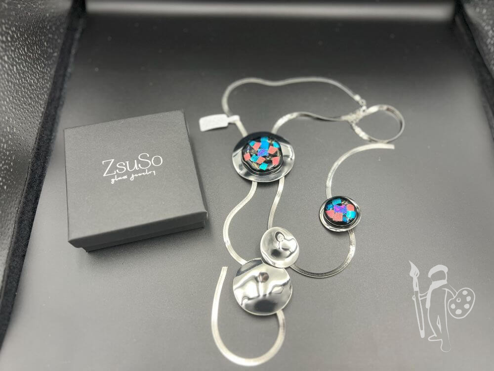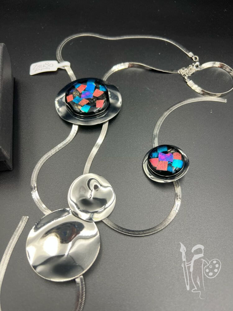 860 fokon olvasztott Dichroic és Bullseye üvegekből egyedileg készítettek a medálok.